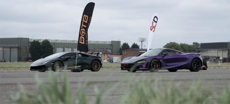 マクラーレン720Sとウラカン・ペルフォルマンテとの加速勝負。ダッシュはウラカンがリード、そのまま逃げ切れるか?