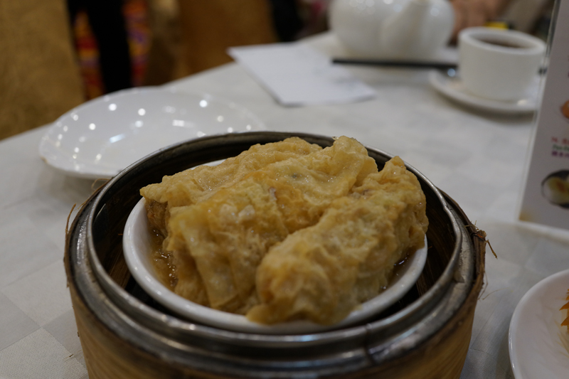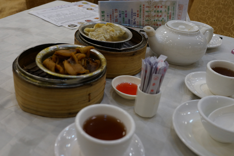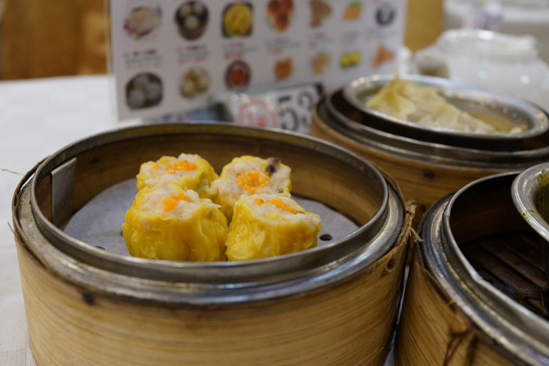 フロアにはこういった感じでワゴンを押した女性がたくさんいるので、「伝票を持って」ワゴンのところへゆき、ワゴンの上にある蒸篭(せいろ)のふたを自分でパカパカと開けて中を確認し、気に入ったものがあれば「これちょうだい」と言って女性に伝票を渡します(何も言わずに蒸篭を指差して伝票を渡すだけでもOK)。