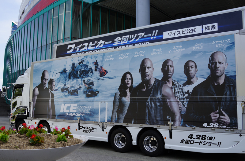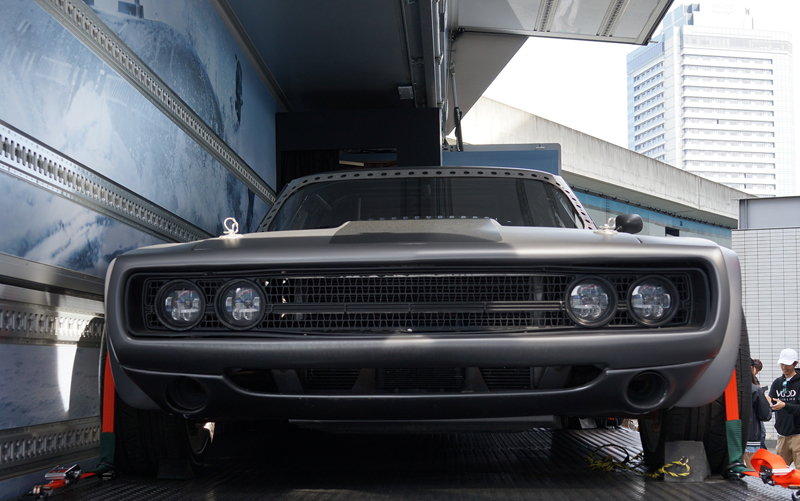 ワイルド・スピード・アイスブレイクの撮影に実際に使用された車両とのことで、10トントラックに積まれて日本全国を巡回中です。