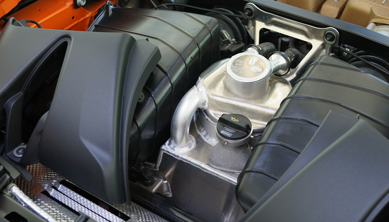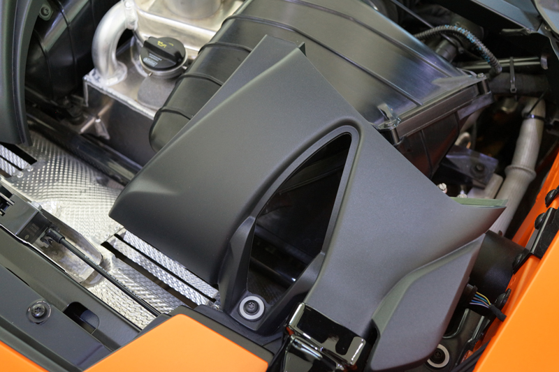 エンジンルーム奥側(室内側)にはフォージド・コンポジットのカバーがありますが、車体後方はALAの稼動部があり、中央にはレーシングカーばりのアルミ製タンクが鎮座。