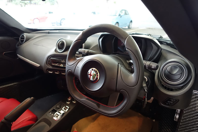 今どきパワステレスなんてありえないだろう、と思いますがとにかく省けるものはなんでも省き、しかしデュアルクラッチなど先進の装備も備える、「簡素なだけではない」アルファロメオ4C。